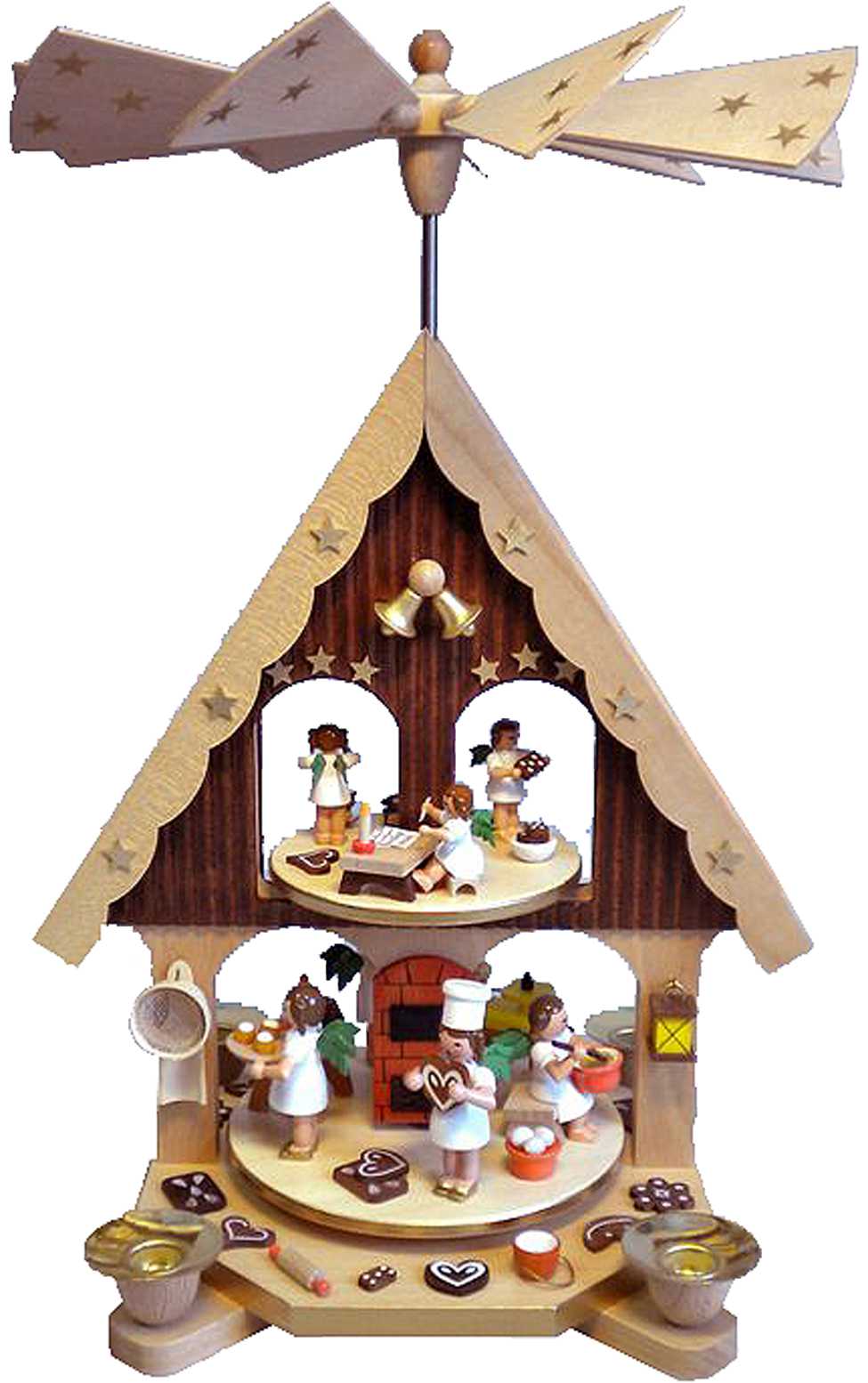 A natural wood this is a two story house design featuring baking Angels in various activities making treats for the holidays. Heat rising from candles turns paddles and base. This uses #29314W white - #29314N natural - or #29314R red candles. Richard Glaesser Dimensions: 13.5''H x 9''W x 9''D. Made in Germany