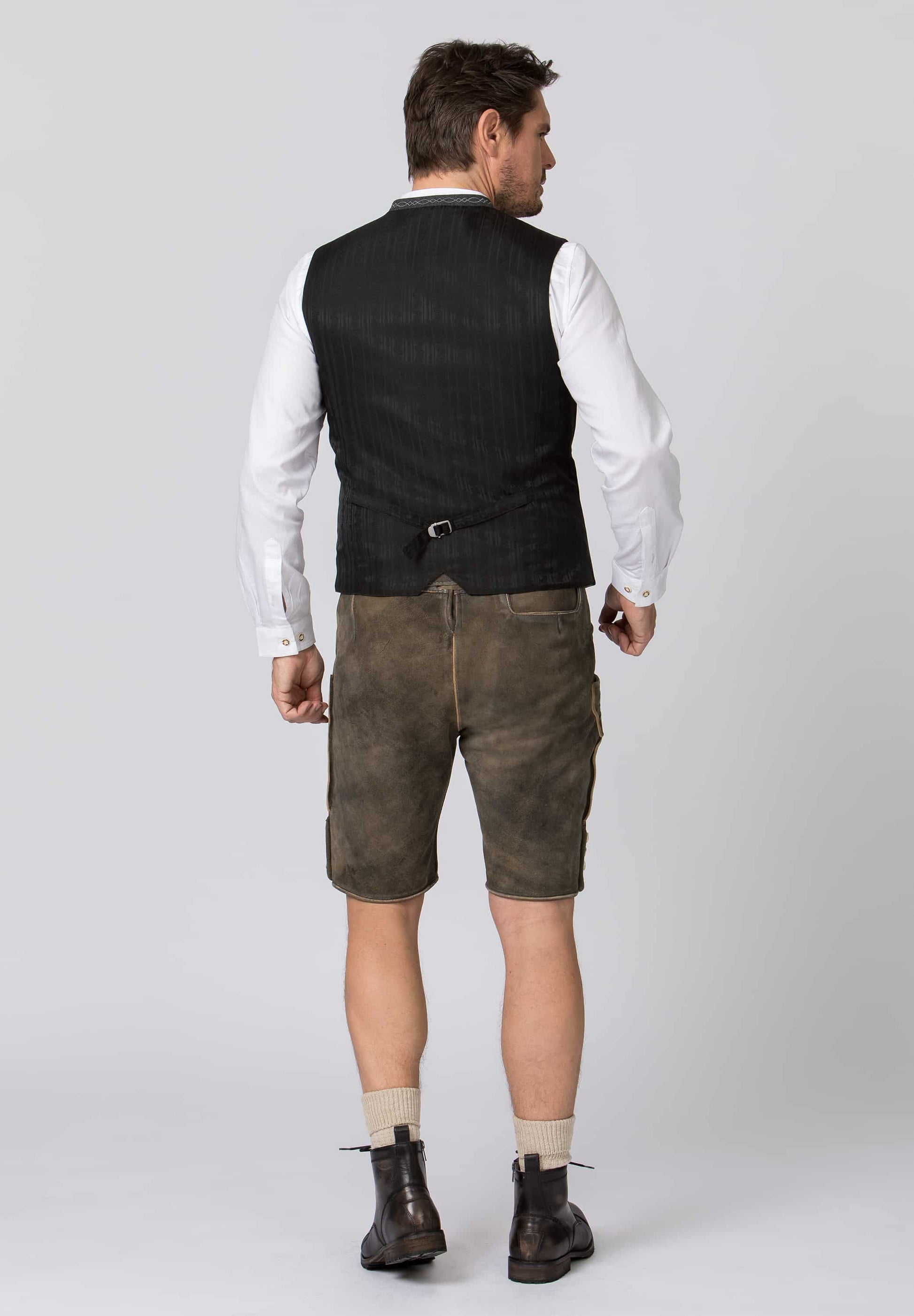 Trachten men's vestRicardo for men in black. This Men's Vest is made of high-quality cotton velvet and is the classic among the traditional vests. An adjustable latch and darts on the back make for a masculine fit. Contrasting piping in suede on the three pockets and on the short stand-up collar with filigree embroidery creates classic accents. Silver round knob buttons complete the look of this Men's Vest. Perfect for lederhosen, jeans or under one of our wool trachten jackets, a vest completes the look.